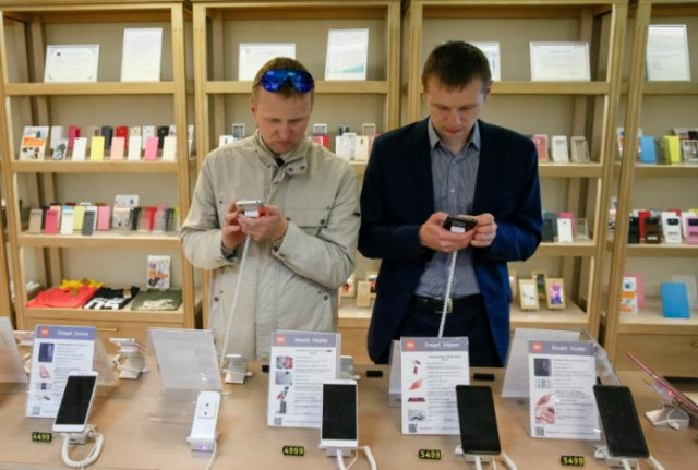 Men try out Xiaomi smartphones at the company's store in central Kiev, Ukraine May 17, 2017. PHOTO: REUTERS