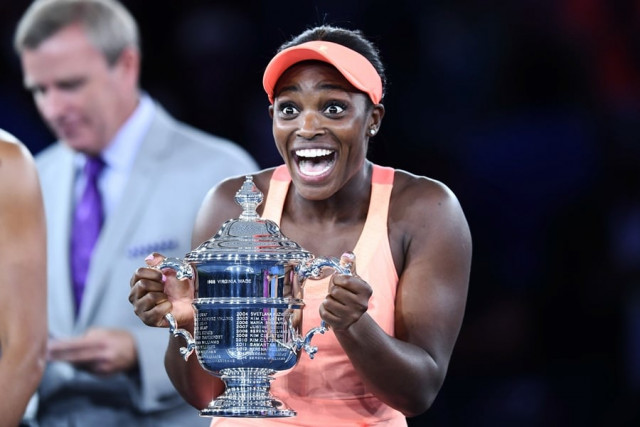Sloane Stephens of the US reacts with winning trophy after defeating compatriot Madison Keys in their 2017 US Open Women's Singles final match at the USTA Billie Jean King National Tennis Center in New York on September 9, 2017.