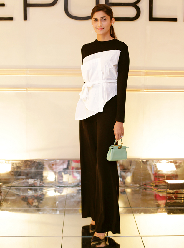 Maleeha looks super pretty in a light blue top with pearl embellishments, paired with paper bag white pants. She adds some oomph to her look with strappy metallic heels and a pop of colour with her bright red Dolce and Gabbana cross body bag! An absolute winner in our books!