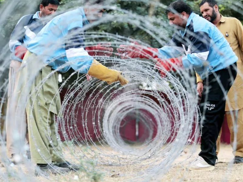Police place barbed wire for traffic management of Chehlum procession. PHOTO: AFP