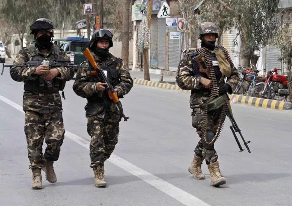 Afghan National Intelligence officers patrol after an assault by suicide attackers. PHOTO: REUTERS