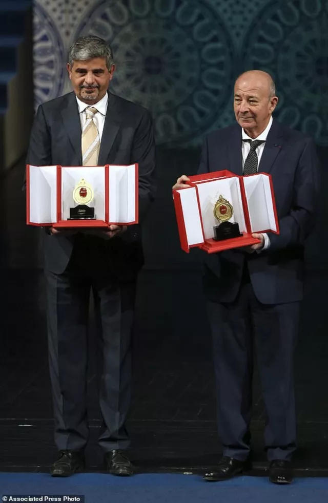Turkish-French Sami Erol Gelenbe, right, and Iranian Mohammad Amin Shokrollahi, two computer science experts, show their awards during the biennial $500,000 Mustafa Prize ceremony at Vahdat Hall in Tehran, Iran, Sunday, Dec. 3, 2017.