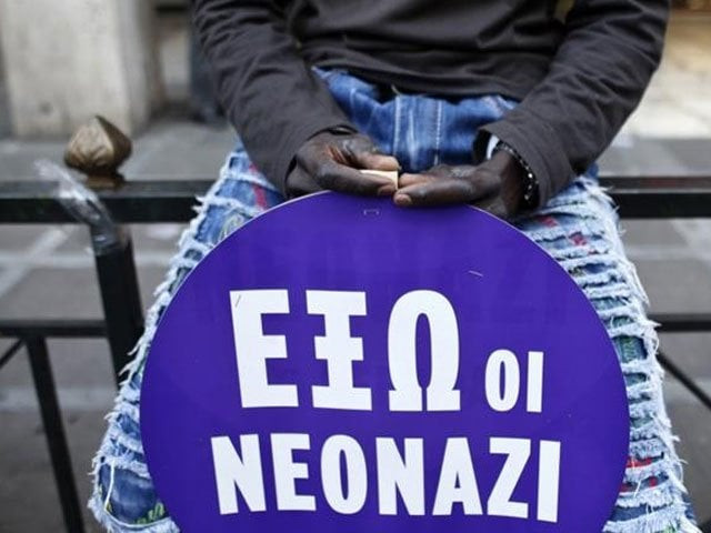 A migrant holds a sign decrying neo-Nazis in the Greek capital. PHOTO: REUTERS/FILE