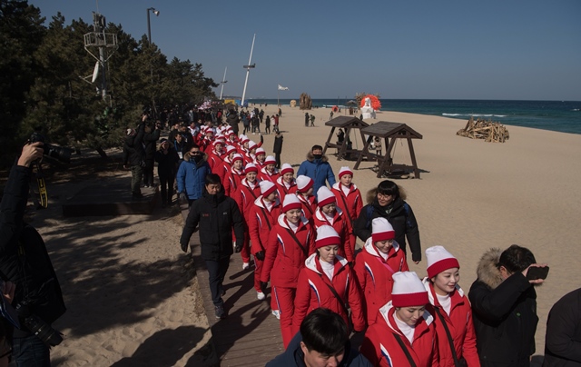North Korean cheerleaders are surrounded by media as they attempt to walk on Gyeongpo beach in Gangneung on February 13, 2018. PHOTO: AFP