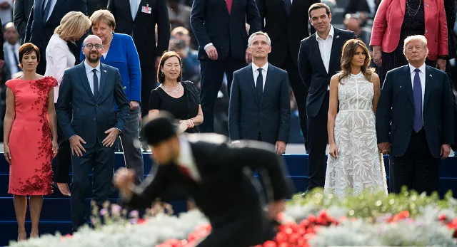 (L/R): PM Michel's partner Amelie Derbaudrenghien , Belgian Prime Minister Charles Michel, First Lady of France Brigitte Macron, Chancellor of Germany Angela Merkel, Stoltenberg's partner Ingrid Schulerud, NATO Secretary General Jens Stoltenberg, Prime Minister of Greece Alexis Tsipras, First Lady of the US Melania Trump and US President Donald Trump watch a show ahead of a working dinner at The Parc du Cinquantenaire - Jubelpark Park in Brussels on July 11, 2018, during the North Atlantic Treaty Organization (NATO) summit. PHOTO: AFP