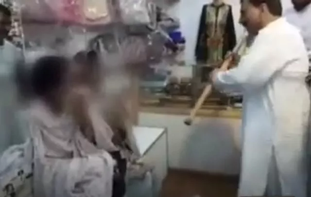 A man beating women with a bamboo stick in a shop in Lahore. SCREENGRAB