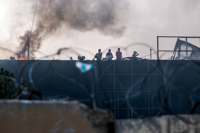 Iraqi protesters gather outside the burnt-down local government headquarters in the southern city of Basra on September 7, 2018. PHOTO: AFP