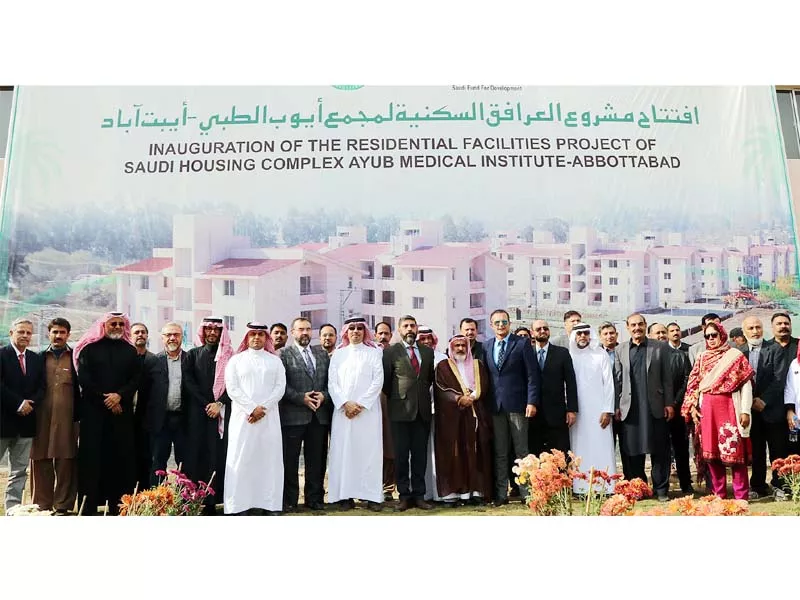 Saudi delegates and Pakistani officials at the inauguration ceremony of a Saudi funded housing complex at Ayub Teaching Hospital Abbottabad. PHOTO: ONLINE
