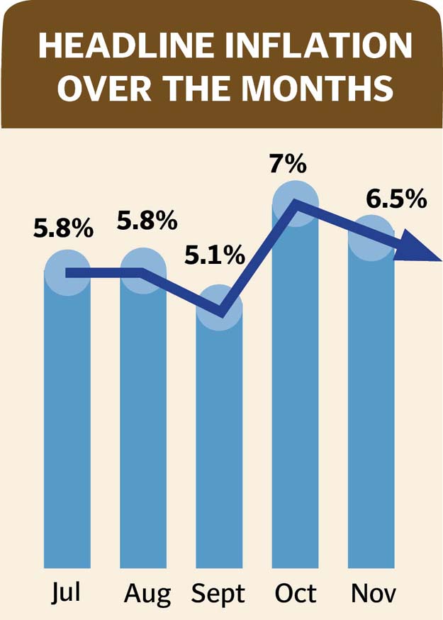 The headline inflation decelerated to 6.5% in November compared to 6.8% in the preceding month, reported the Pakistan Bureau of Statistics (PBS) on Tuesday. The pace slowed down despite inflationary expectations and increase in prices of petroleum products last month.