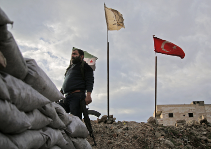 A fighter from Faylaq al-Sham (Sham or Levant Legion), one of the factions of the Turkish-backed National Liberation Front (NLF) factions, is seen holding a Kalashnikov assault rifle as he stands in front of the flags of (L to R) the Syrian opposition, the faction, and Turkey, at a position in the village of Kiridiyah, about 30 kilometres west of the northern town of Manbij, on January 15, 2019. PHOTO: AFP