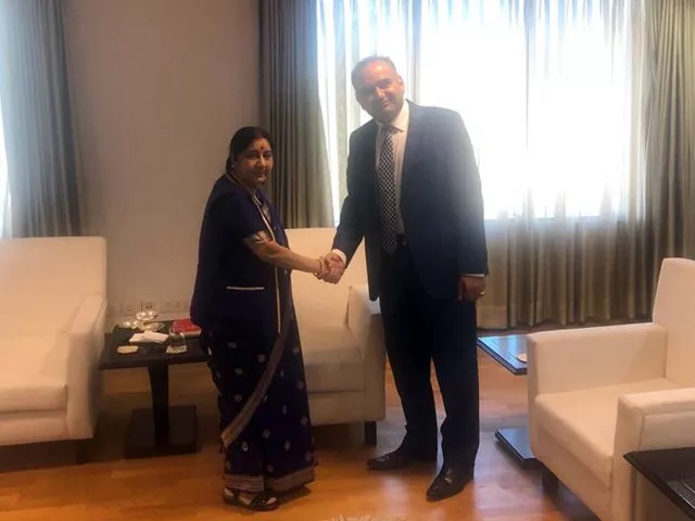 PTI’s Ramesh Kumar Vankwani meets Indian External Affairs Minister Sushma Swaraj. PHOTO: EXPRESS