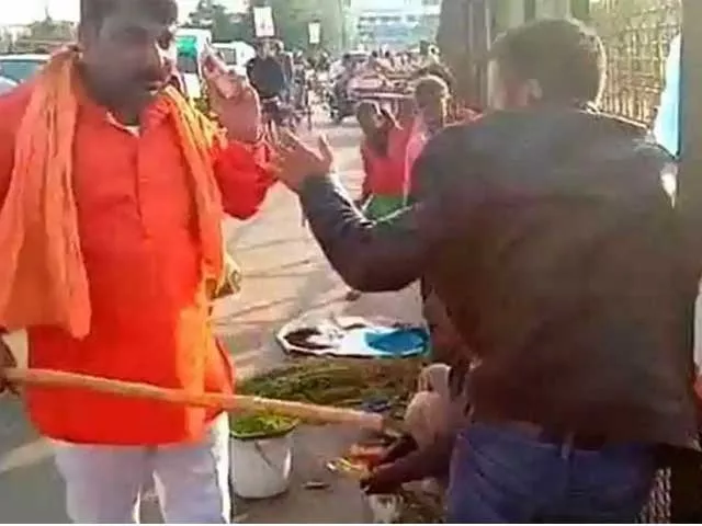 Kashmiri vendors being beaten by BJP workers on a busy street in Lucknow. PHOTO: EXPRESS