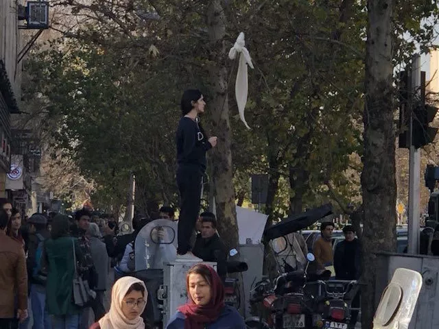 In December 2017, she stood on a pillar box on Enghelab Avenue without the mandatory long coat and raised her white veil on a stick, an act that was copied by women in different cities.
