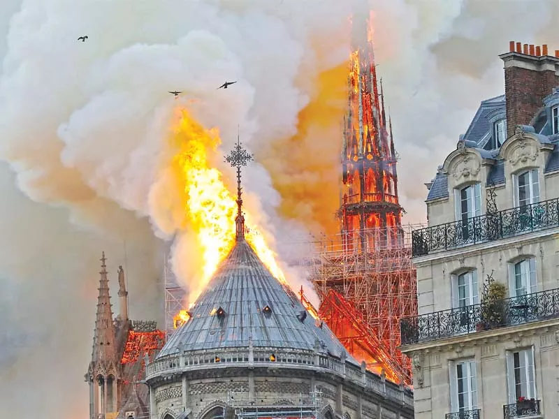 Firefighters enter the cathedral and bring out some of its priceless artworks