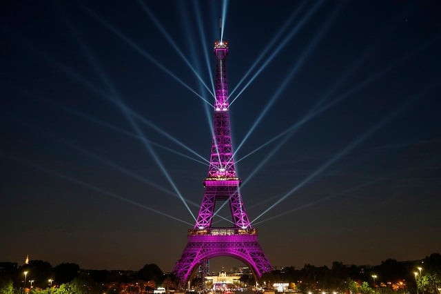 A picture taken on May 15, 2019 shows the Eiffel Tower during a light show celebrating the 130th anniversary of its construction, in Paris. - Built for the 1889 World's Fair, towering at 324 meters and weighing 7300 tons, the Eiffel Tower attracts nearly seven million visitors every year. PHOTO: AFP