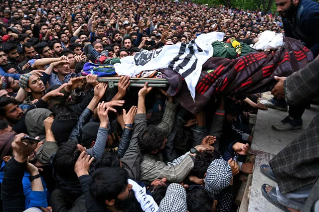 People carry the body of a freedom fighter during his funeral in occupied Kashmir’s Karimabad village on May 16, 2019. PHOTO: AFP