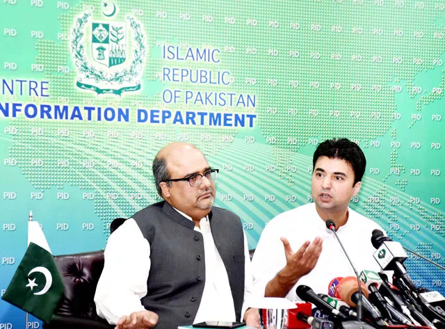 Special Assistant to the Prime Minister on Accountability Shahzad Akbar with Minister for Communications and Postal Services Murad Saeed in a press conference in Islamabad on Monday. PHOTO: PID