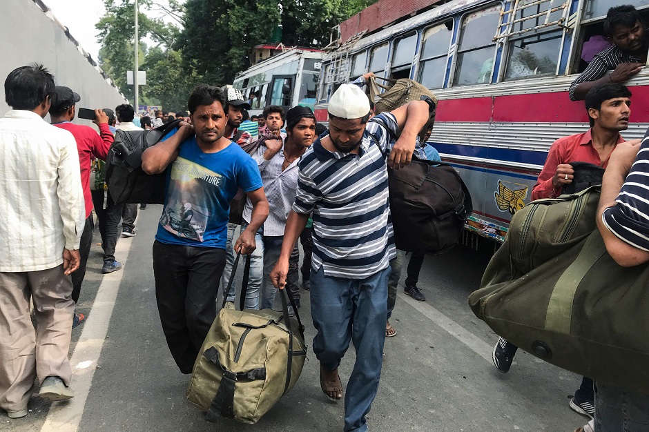 Labourers from across India working in Kashmir wait outside Jammu Railway Station as they leave to go back to their home states due to the heightened security situation in Jammu. PHOTO: AFP