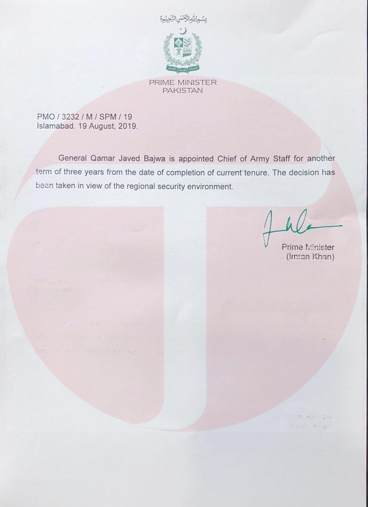 "General Qamar Javed Bajwa is appointed Chief of Army Staff for another term of three years from the date of completion of current tenure. The decision has been taken in view of the regional security environment," said a brief statement issued by the PM office on Monday.