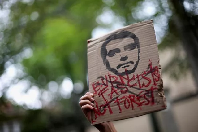 An activist holds a sign with an illustration of Brazilian President Jair Bolsonaro as they demand more Amazon rainforest protection at the embassy of Brazil in Mexico City, Mexico August 23, 2019. (Photo: REUTERS)