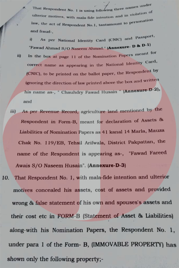 “That Respondent No 1 ( Fawad Chauhdry ), with mala-fide intention and ulterior motives, concealed his assets, cost of assets and provided wrong & false statement of his own and spouses’ assets and their cost in FORM-B( statement of Assets and Liabilities) along with Nomination Papers,” para 10 of the petition claimed.