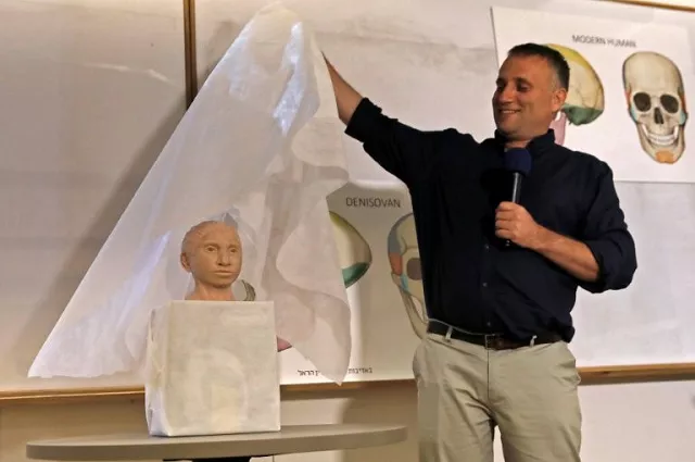 Israeli Professor Liran Carmel, of the Hebrew University in Jerusalem, reveals the first model of man's long-lost Denisovan cousin on September 19, 2019. PHOTO: AFP