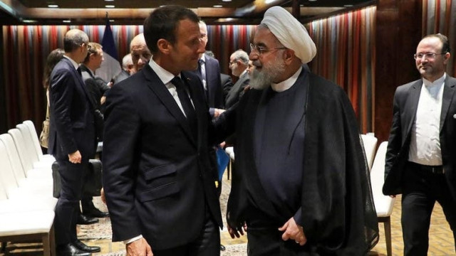 French President Emmanuel Macron (L) and Iranian President shake hands at the UN headquarters on September 23, 2019, in New York. PHOTO: AFP