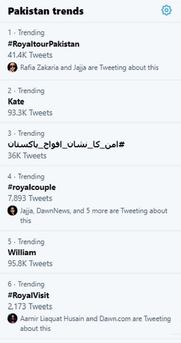 The micro-blogging site was abuzz as seven top trends in Pakistan are about the Britain’s Duke and Duchess of Cambridge and their five day maiden visit to Pakistan.