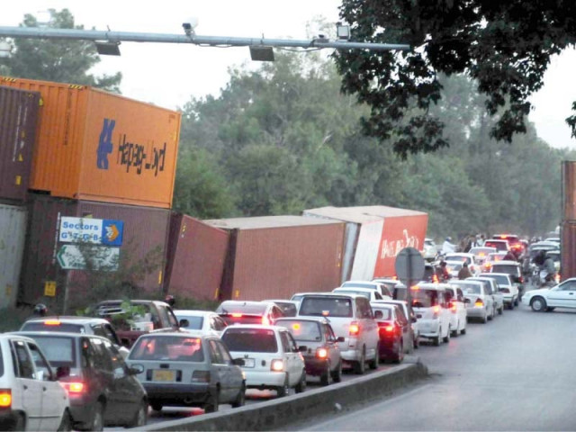 Containers placed on the road leading to Red Zone cause heavy traffic jam. PHOTO: PPI/EXPRESS