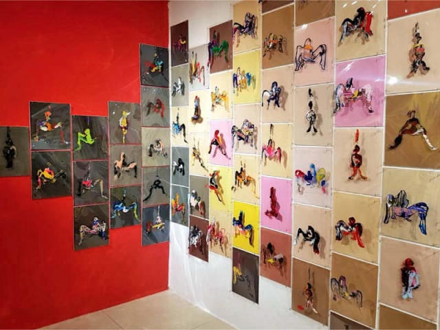 In another piece, titled 'Claiming space', Najm has made multiple small and quick abstract gestural paintings on mylar, which rebels against the social responses towards women and claim more space as the paintings spread across the wall. From far, these small paintings look like a grid-formed plethora of abstract imagery, but on closer inspection, one would observe them as a movement of many women slowly spreading and breaking the cage of cringed-in limited spaces, while at the same time balancing attributes like patience, control, sensibility and maturity.