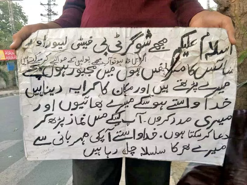 The placard he carries in his hands is inscribed with “My father is suffering from three diseases and is unable to purchase medicines and bear home expenses. You are requested to help and I will offer prayers for you and your family. You may get me arrested if it is proven that I am telling a lie.”