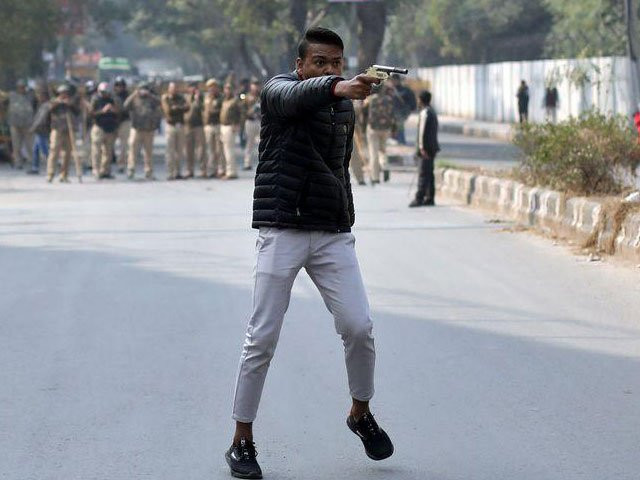 An unidentified man brandishes a gun during a protest against a new citizenship law outside the Jamia Millia Islamia university in New Delhi, India, January 30, 2020. PHOTO: REUTERS