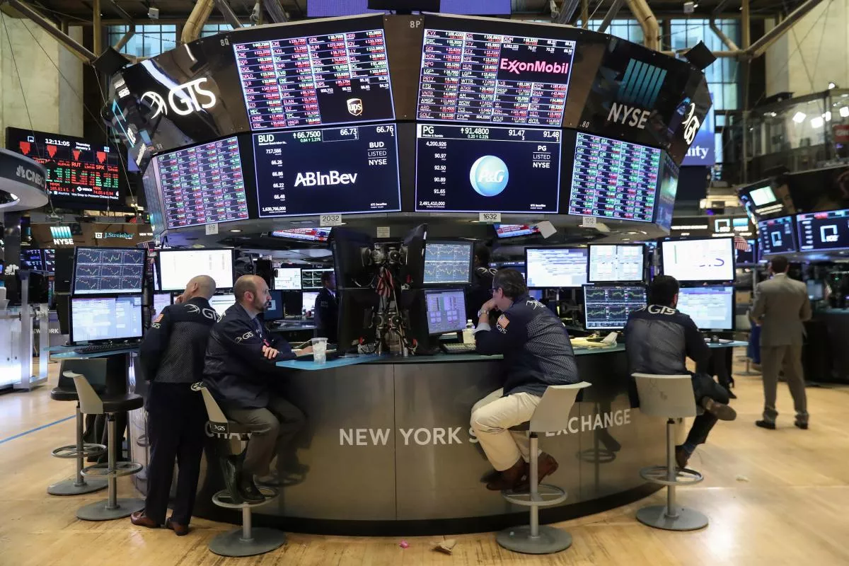 Traders look at price monitors as they work on the floor at the New York Stock Exchange (NYSE) in New York City. PHOTO: REUTERS