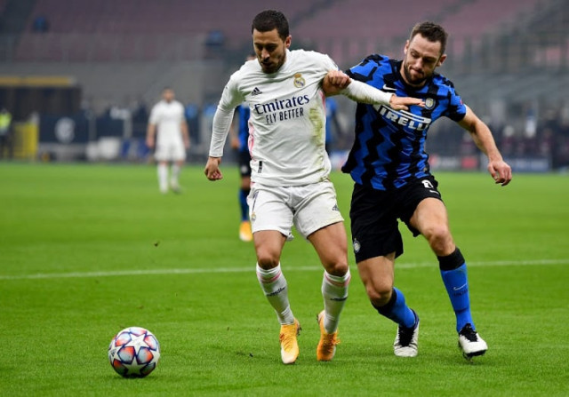 Real, without Karim Benzema and Sergio Ramos, were gifted an early lead when Nicola Barella clipped Nacho's heels as he was about to shoot and Hazard comfortably converted the penalty.