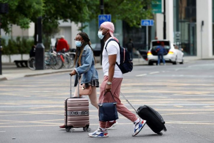 People wear protective masks as they walk with suitcases through the city centre, amid the outbreak of the coronavirus disease (COVID-19) in Manchester, Britain, June 21, 2021. REUTERS/Phil Noble