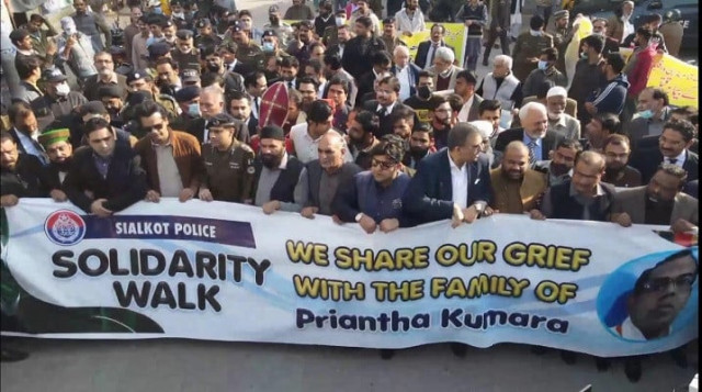 Sialkot police on Saturday organised a walk to show solidarity with the family of the Sri Lankan national Priyantha Kumara, who lynched by a mob in the city earlier this month.