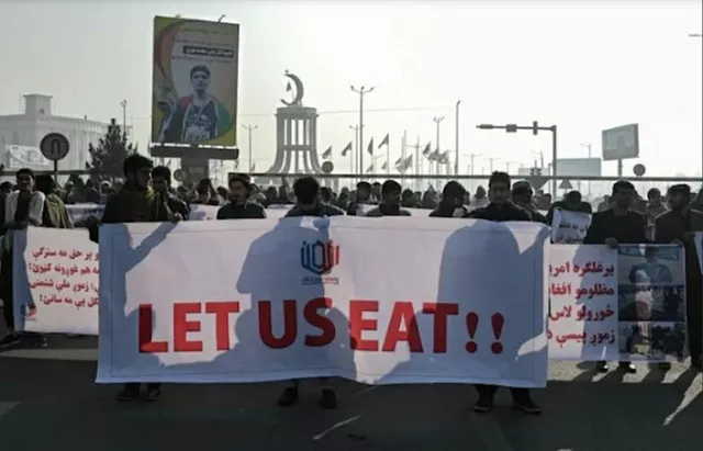"Let us eat" read one banner carried by a marcher near a square in central Kabul.