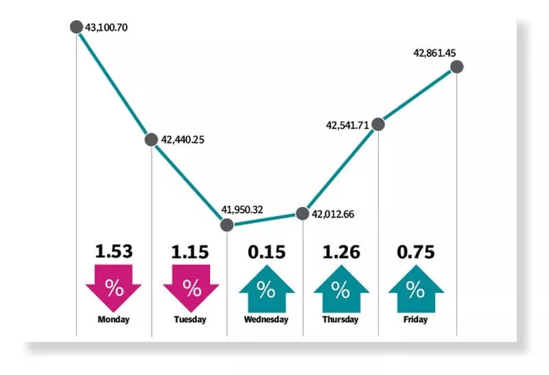Consequently, the benchmark KSE-100 index closed the week with a loss of 239 points, or 0.56%, at 42,861.