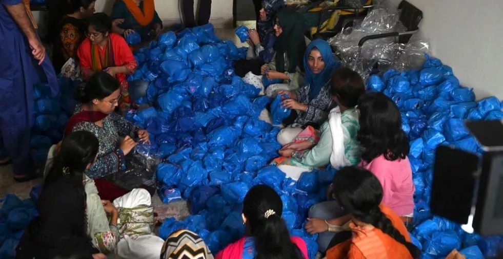 Since June, Mahnoor and colleague Anum Khalid have mobilised friends and volunteers to raise money to buy, pack and distribute emergency sanitary kits containing pads, underwear and soap.
