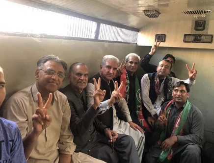 PTI leaders Shah Mahmood Qureshi, Asad Umar and others sit in a police van following their arrest in Lahore. PHOTO: NNI