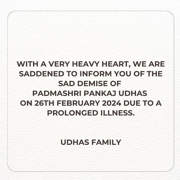 His daughter, Nayaab Udhas, shared a statement expressing the family's sorrow, "With a very heavy heart, we are saddened to inform you of the sad demise of Padmashri Pankaj Udhas on 26th February 2024 due to a prolonged illness. Udhas family (sic)."