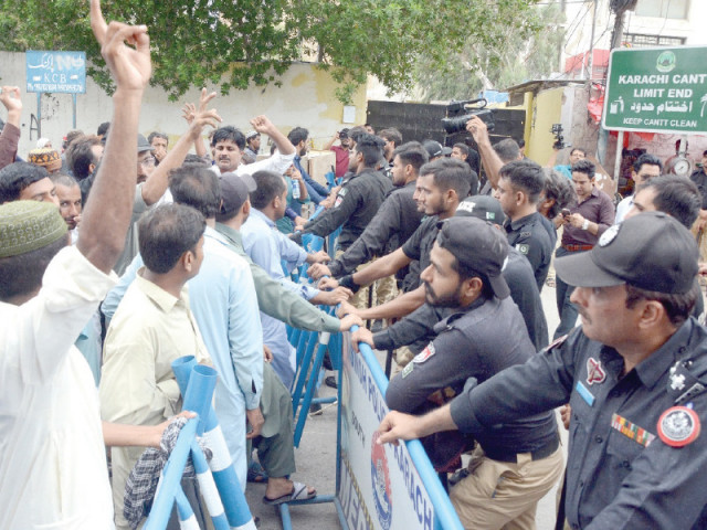 Police officials stop protestors marching from Karachi Press Club towards the CM House. photo: Jalal Qureshi/Express