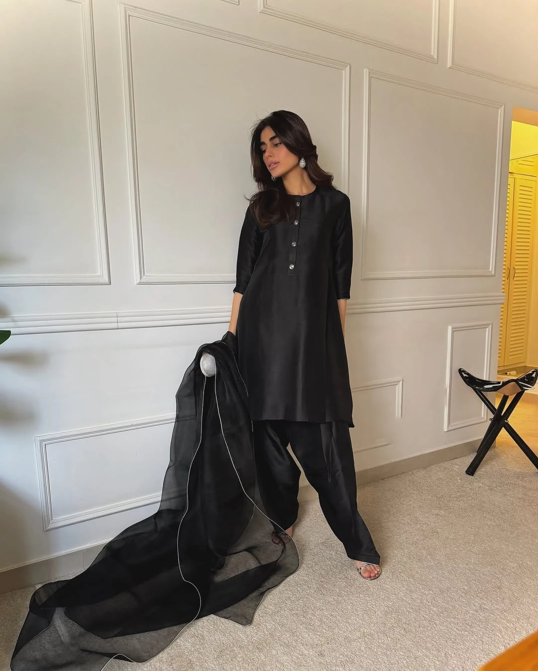 Eid 2025 falls in a cooler season, which means you can rock silk fabrics without worrying about the summer heat. This luxurious fabric gives off a regal feel and is a top choice for many fashion-forward Eid-goers. Think elegant, flowy dresses, or simply opt for a silk top paired with a bold bottom for that royal vibe. Be ready to see more Sadaf Kanwal’s pure raw silk outfits this Eid—this fabric is going to be everywhere!