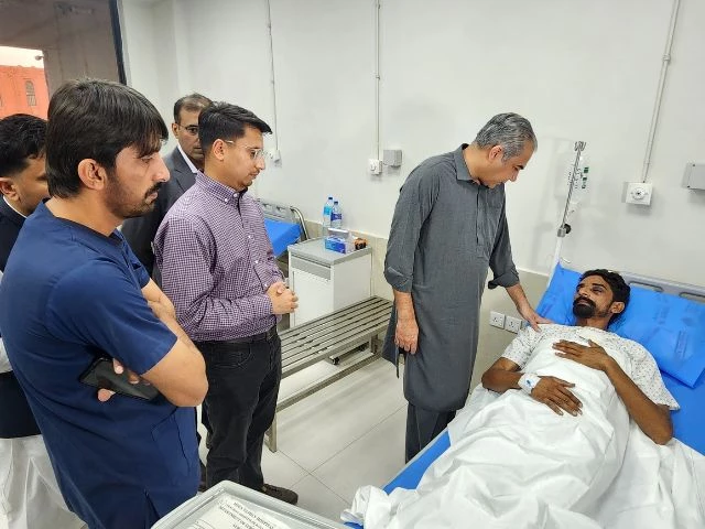 Federal Interior Minister Mohsin Naqvi visited Holy Family Hospital in Rawalpindi to inquire about Tauqeer Abbas, who was injured in an Indian drone attack near the Rawalpindi Cricket Stadium.