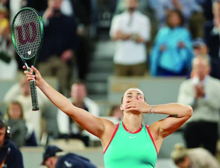 Aryna Sabalenka celebrates winning her French Open semifinal against Iga Swiatek at Roland Garros, Paris. PHOTO: REUTERS