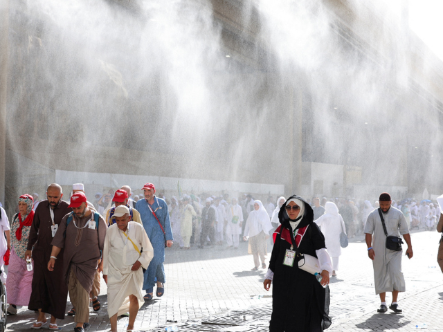 Pilgrims walk as water sprinklers spray water during the annual hajj pilgrimage in Mina. Reuters