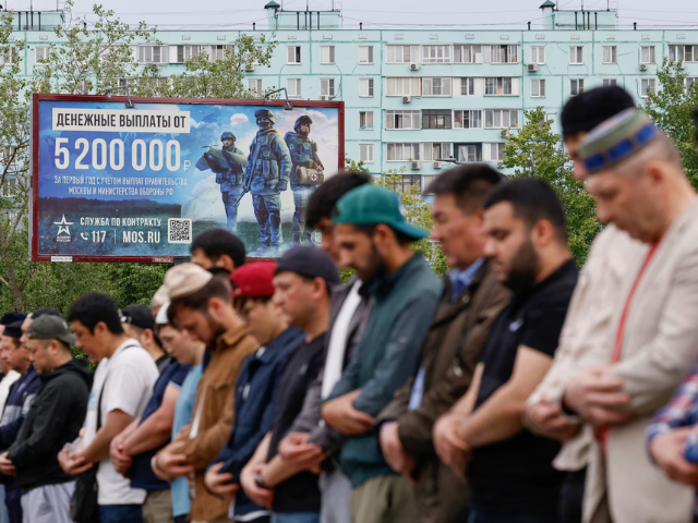 Muslims attend Eidul Azha prayer, marking the end of the hajj pilgrimage, near a board promoting service in the Russian army and invites volunteers to sign a contract with the defence ministry, in Moscow, Russia June 6. REUTERS/Yulia