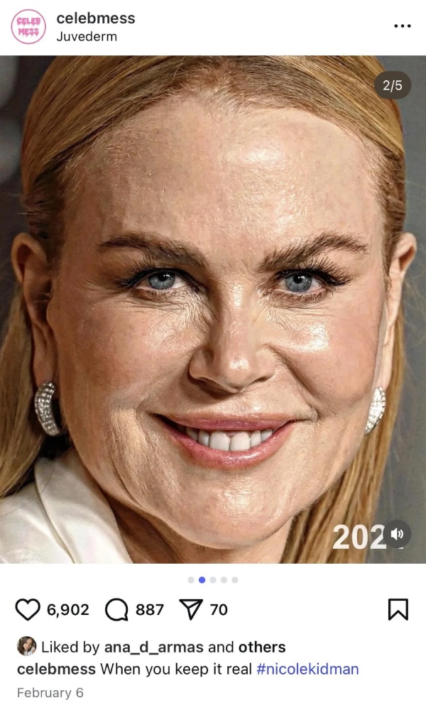 The post, shared by celebrity gossip account celebmess, featured a harsh close-up of Kidman’s face with the word “Juvederm” added and the caption “When you keep it real #nicolekidman.”