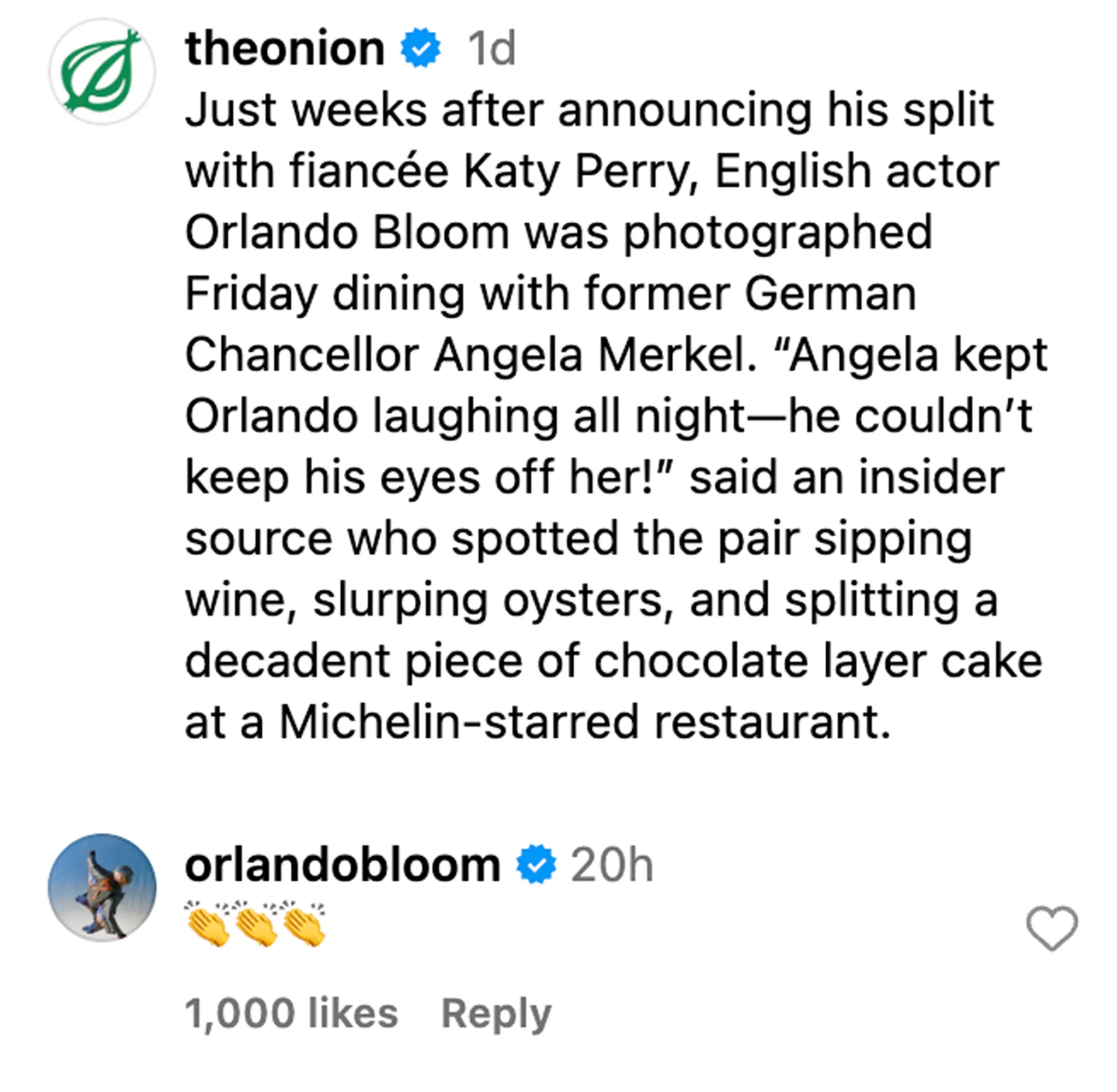 The satirical post from The Onion joked: “Just weeks after announcing his split with fiancée Katy Perry, English actor Orlando Bloom was photographed Friday dining with former German Chancellor Angela Merkel. Angela kept Orlando laughing all night — he couldn’t keep his eyes off her!”