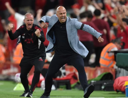 Liverpool manager Arne Slot celebrates their third goal scored by Federico Chiesa in the EPL season opener. REUTERS